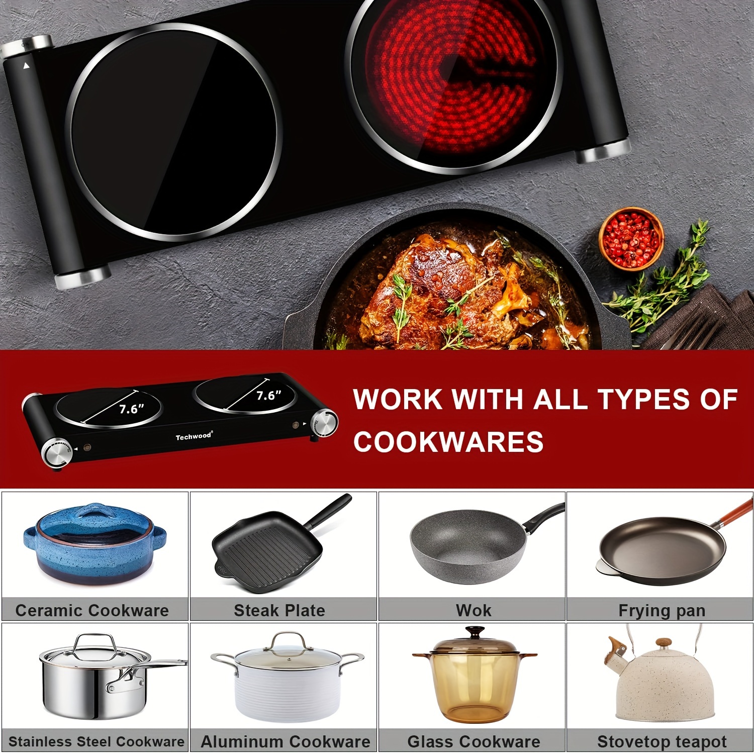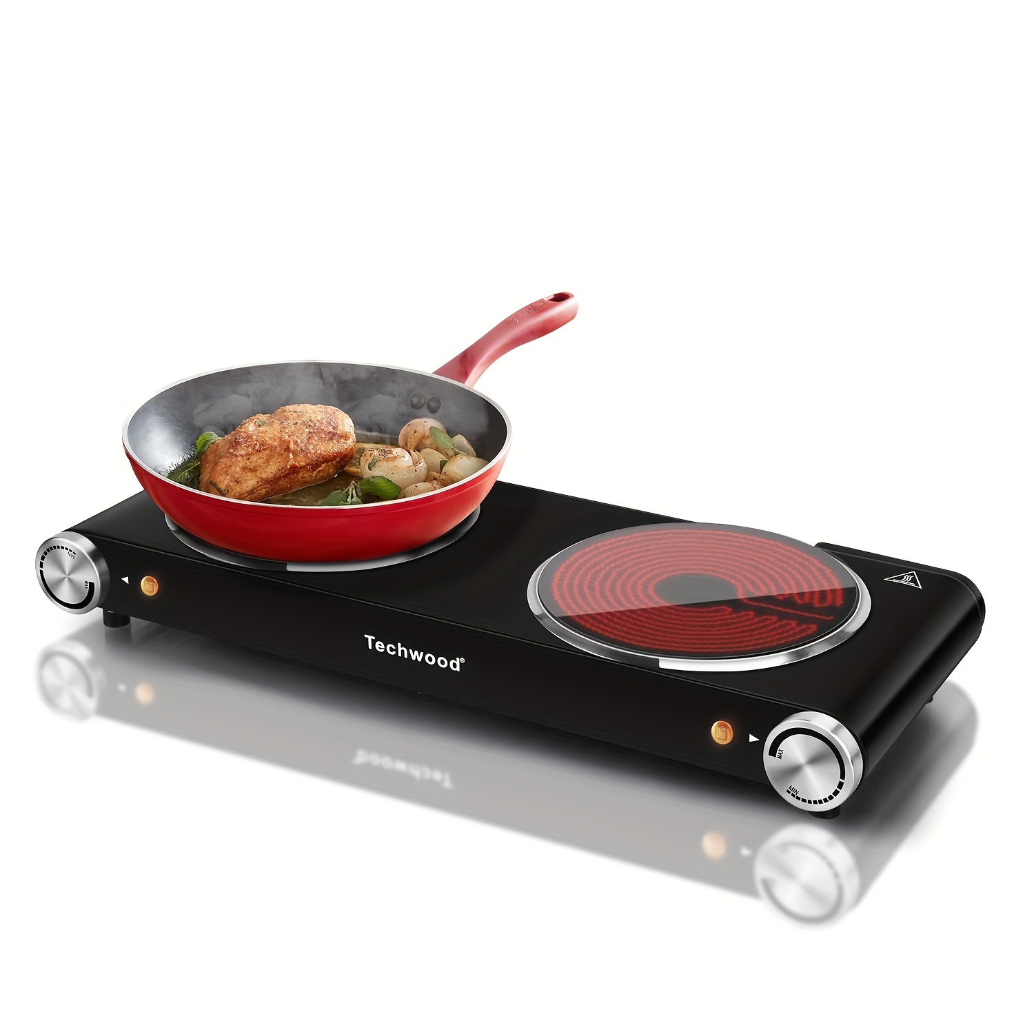 placa de cocina de cerámica infrarroja de 2 quemadores, quemador eléctrico portátil de acero inoxidable, control de perilla, fácil de limpiar (negro)