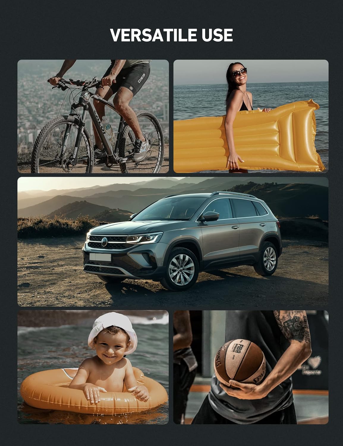 • Inflado rápido y trabajo continuo de 15 minutos: con motores metálicos duales y un cilindro de metal, el inflador de neumáticos puede funcionar continuamente hasta 15 minutos. El modo de gran volumen proporciona una tasa máxima de inflado de 350 l/min para inflar con rapidez artículos grandes. El modo de alta presión bombea hasta 150 PSI para inflar un neumático plano de 0 PSI a 36 PSI en 6 minutos. Compatible con automóviles, bicicletas, sedanes y SUV de tamaño medio. Aviso: esta bomba es incompatible con camiones pesados.