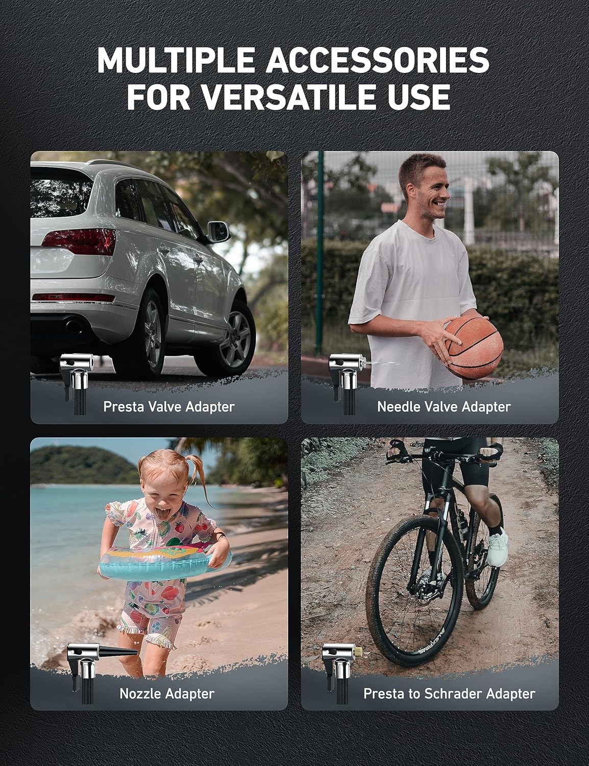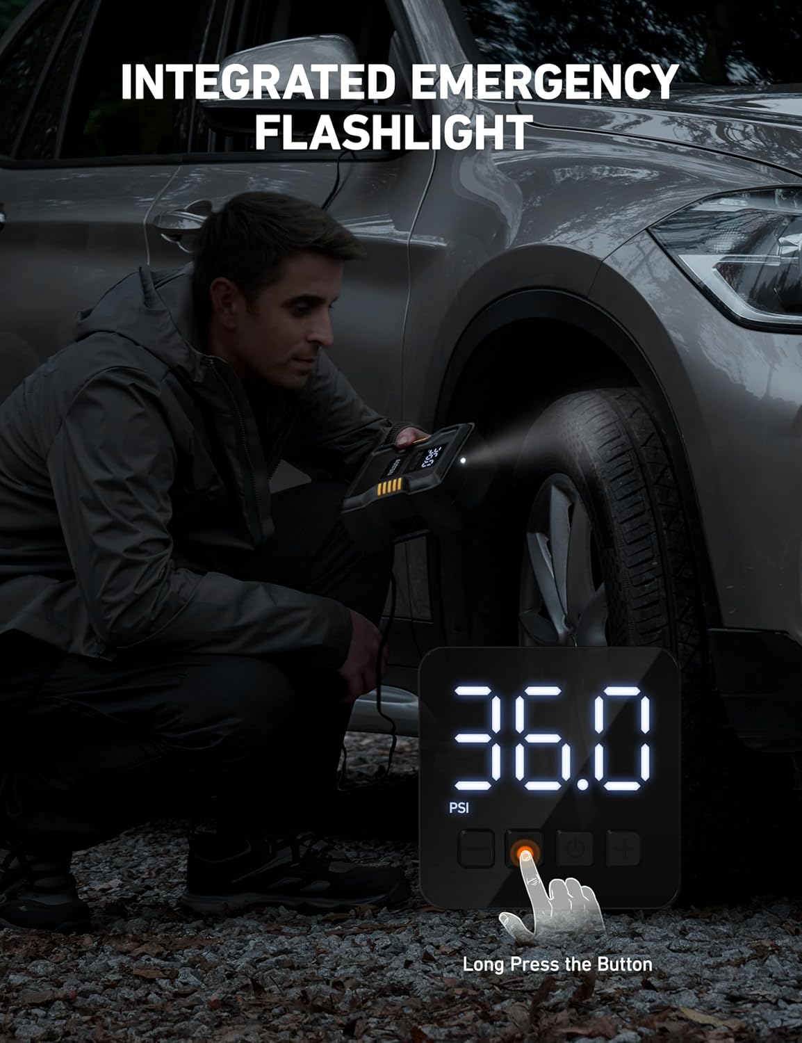 • Apagado automático de llenado y luz LED: la pantalla del compresor de aire portátil mostrará tanto la presión preestablecida de los neumáticos como la presión en tiempo real. El inflador se apagará automáticamente cuando alcance el valor preestablecido, no más preocuparse por el sobreinflado y no hay necesidad de controlar todo el proceso. Mantén presionado el botón del interruptor de la unidad para encender la luz, hace que inflar y cambiar neumáticos en la oscuridad sea mucho más fácil.