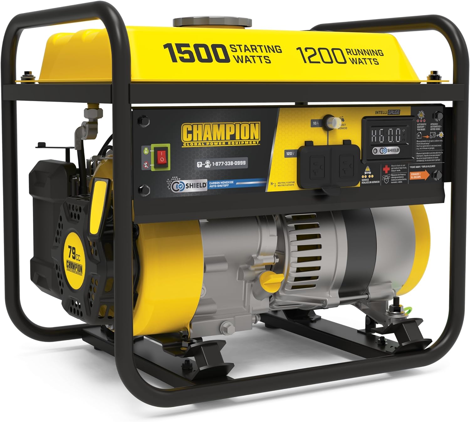 El generador portátil Champion Power Equipment 201285 de 1200 vatios con escudo de CO está diseñado pensando en tu seguridad y comodidad. Con 1500 vatios de arranque y 1200 vatios de funcionamiento, este generador resistente proporciona justo lo que necesitas para uso en RV, camping, portón trasero, canotaje, caza, viajes de fin de semana y pequeños trabajos en la casa. Durante una interrupción, el motor de un solo cilindro Champion de 79 cc proporcionará la potencia que necesita para algunos artículos esenciales en caso de emergencia: luces, microondas, ventilador, TV, módem/enrutador, cargador de teléfono celular, etc. Nota: esta unidad no se recomienda para respaldo de emergencia en el hogar para alimentar acondicionadores de aire, estufas, hornos o bombas de sumidero. La tecnología CO Shield monitorea la acumulación de monóxido de carbono (CO), un gas venenoso producido por el escape del motor cuando el generador está funcionando. Si CO Shield detecta niveles elevados inseguros de gas CO, apaga automáticamente el motor. CO Shield no es un sustituto de una alarma de monóxido de carbono en interiores o para un funcionamiento seguro. NO permita que los gases de escape del motor entren en un área confinada a través de ventanas, puertas, rejillas de ventilación u otras aberturas. Los generadores SIEMPRE deben usarse al aire libre, lejos de los edificios ocupados con escape del motor apuntando lejos de personas y edificios. Cumple con los requisitos de ANSI/PGMA G300-2018.