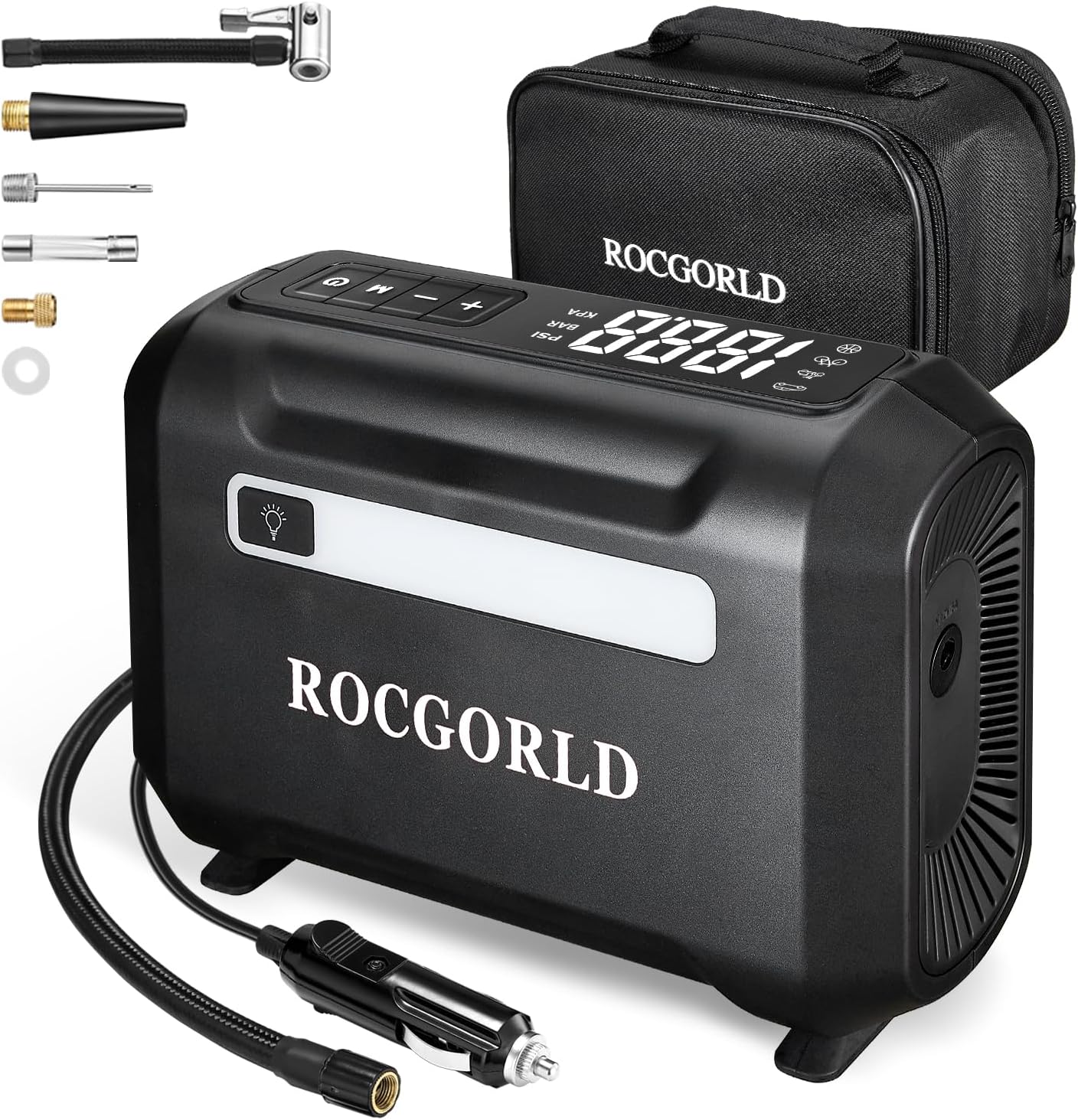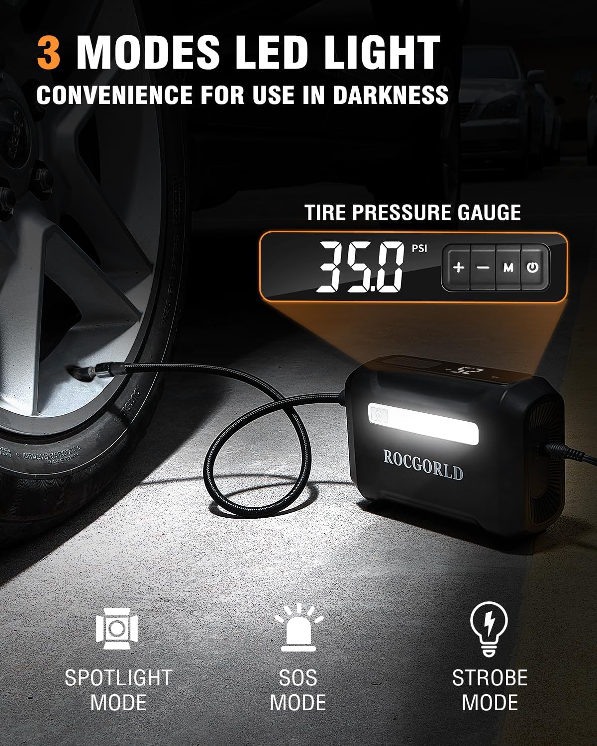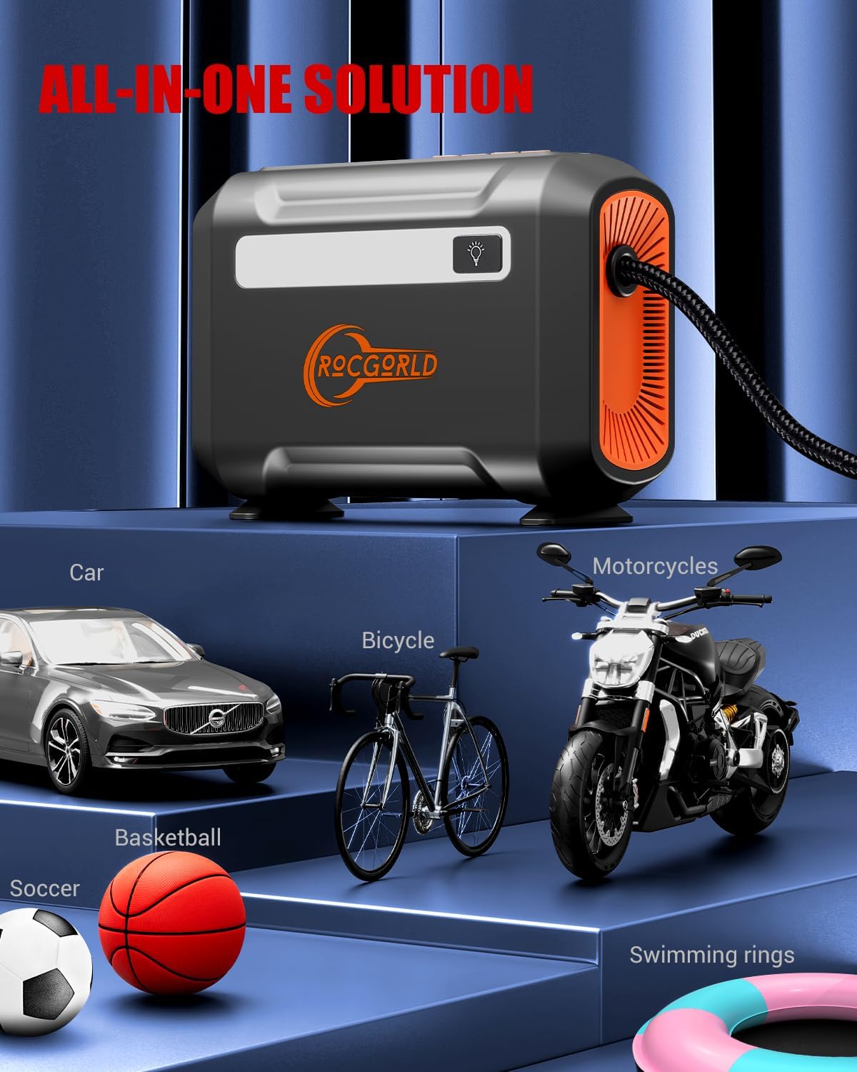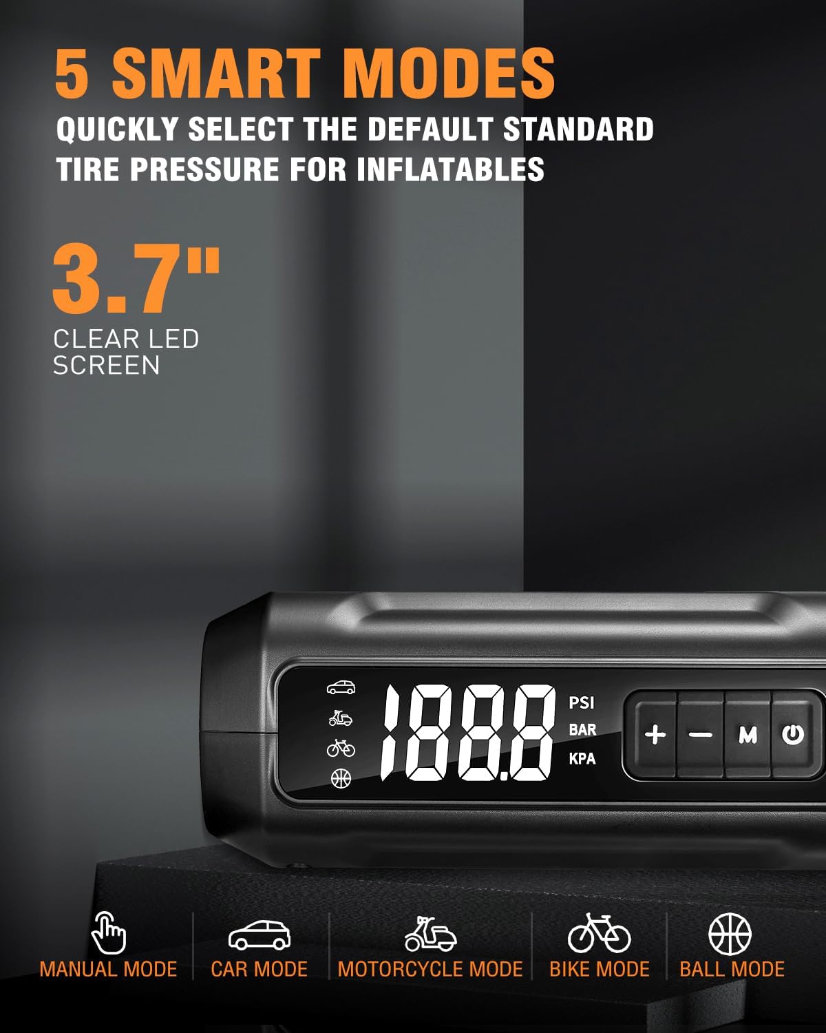 - Simplicidad con parada automática: solo tres pasos: conectar, preajustar y iniciar; También cuenta con apagado automático y una función de memoria para un fácil uso con una tecla la próxima vez. Es fácil de usar incluso si no has utilizado un compresor de aire similar con inflador de neumáticos antes. Además, es un dispositivo de emergencia con tres modos de luz para uso nocturno. Este compresor de aire para neumáticos de automóvil es adecuado para automóviles, vehículos eléctricos, motocicletas, bicicletas, pelotas de baloncesto y pelotas de fútbol.