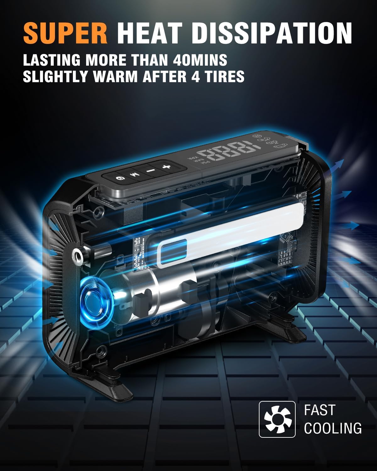 - Pantalla digital dual: Una experiencia completamente nueva nuestra bomba de aire para automóvil con una pantalla LED digital dual que muestra valores de presión preestablecidos y en tiempo real, estado del producto y posibles errores. El chip avanzado garantiza un inflado seguro con control y monitoreo de presión precisos. Di adiós a las conjeturas y hola a la comodidad con nuestro compresor de aire portátil fácil de usar para neumáticos de automóvil.