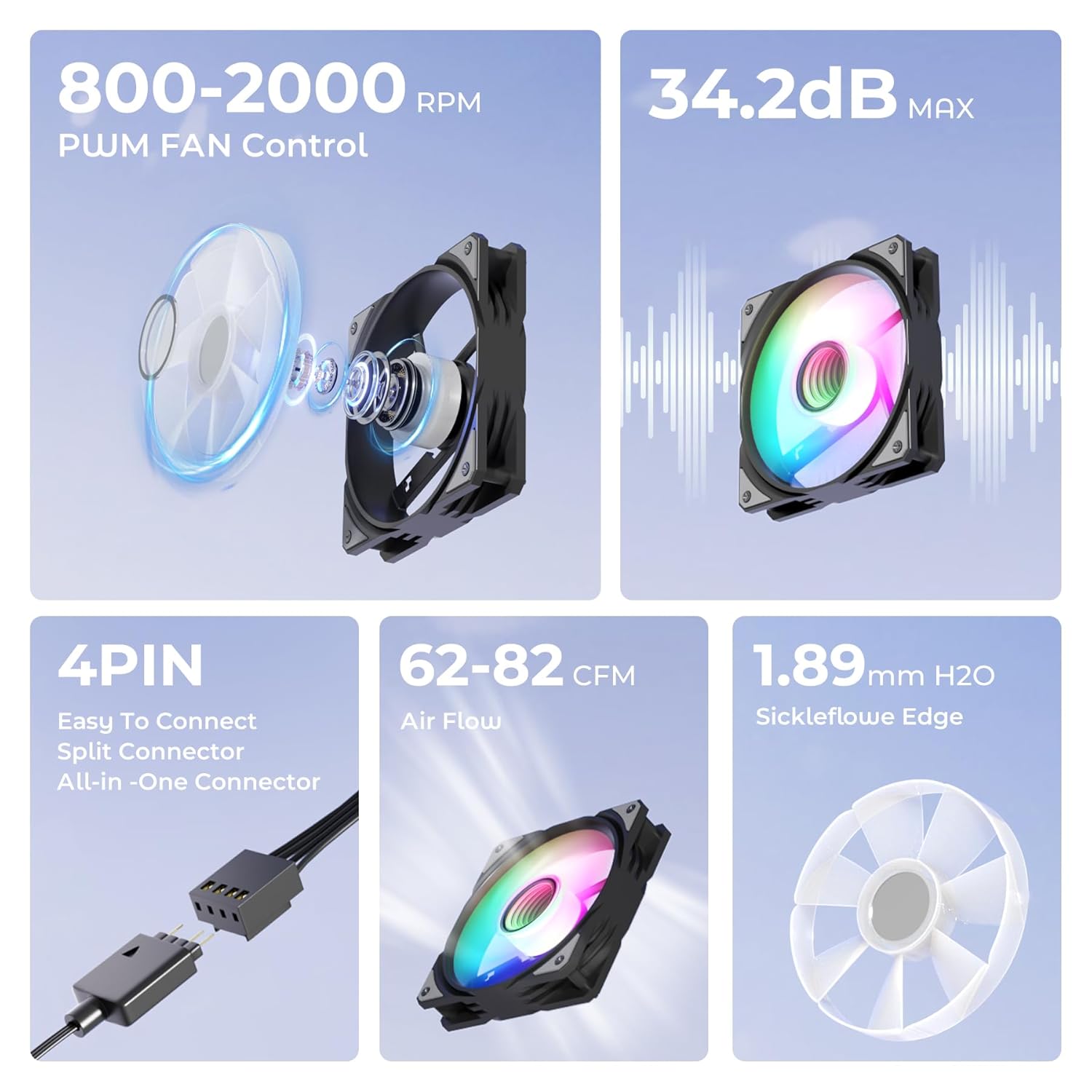 - Parámetros del ventilador: Más información sobre los ventiladores: Velocidad: 2000 RPM, tamaño: 2 Pcs 4.724×4.724×0.984 in, ruido ≤34.2 dBA, interfaz de fuente de alimentación: 4PIN PWM, interfaz de luz: 5V/3PIN ARGB, flujo de aire: 62-82 CFM (MAX)