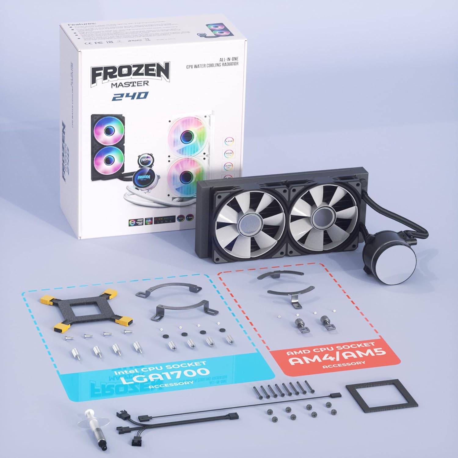 - Mejor refrigeración: el congelador de líquido de CPU adopta el cabezal de bomba avanzado + 2 ventiladores ARGB de 4.724 in + placa disipadora de calor de aleta de aluminio negro de 240 filas frías + tubo de agua de malla de preparación protectora, para crear una baja vibración, alta disipación de calor, baja evaporación, alta vida útil del enfriador refrigerado por agua de una sola pieza