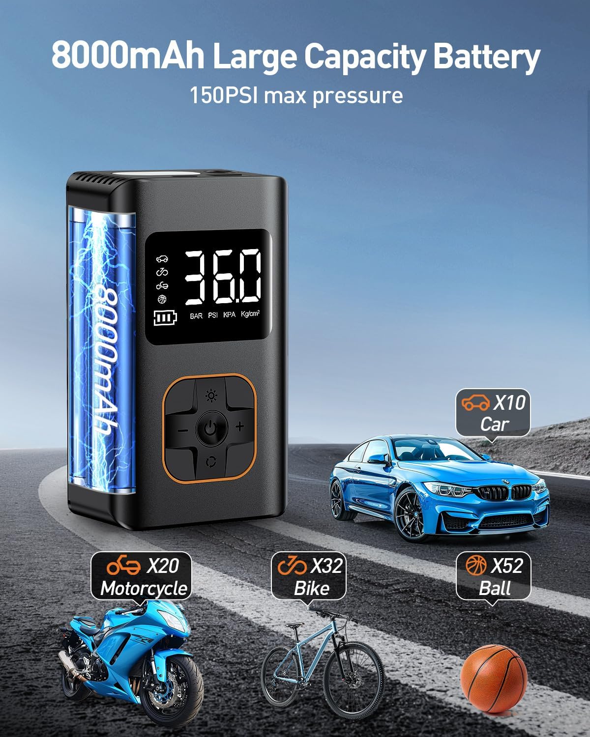 bomba de aire inalámbrica de 8000 mAh para neumáticos de automóvil, bomba eléctrica de neumáticos de bicicleta de 150 PSI con luz LED y medidor de