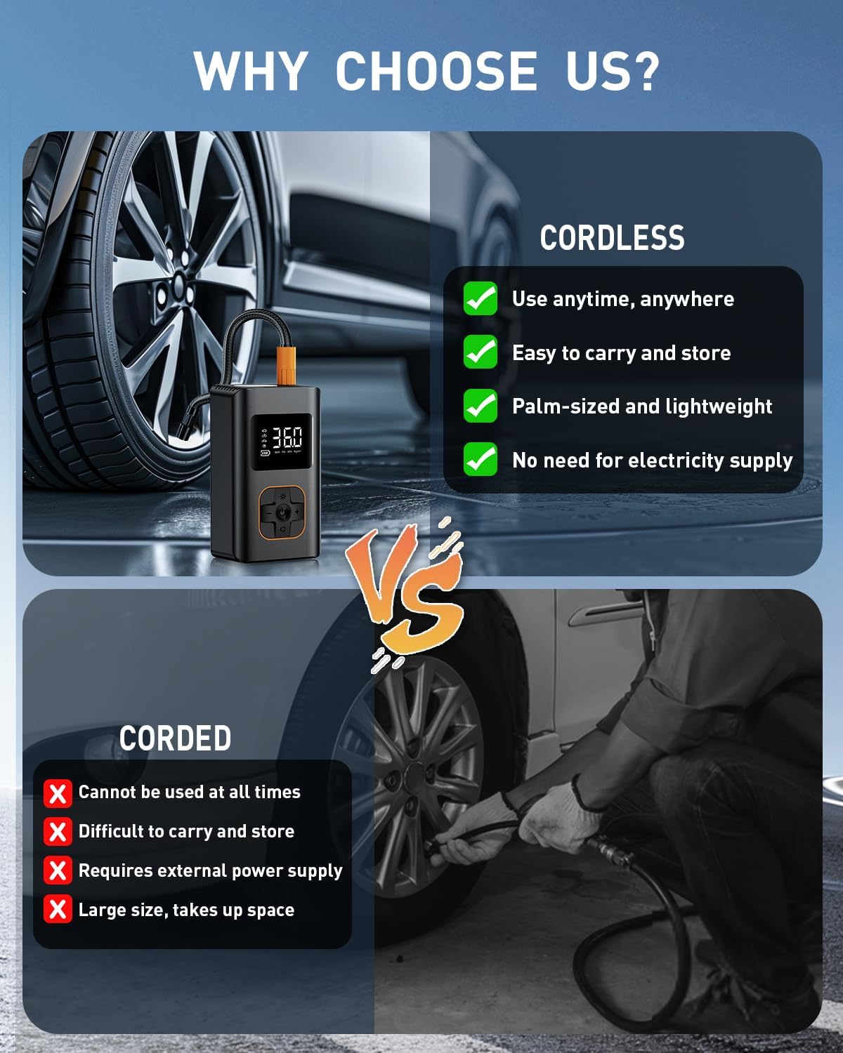 • Batería de larga duración: nuestro inflador de neumáticos portátil para automóvil tiene una batería recargable de gran capacidad incorporada, con solo una carga completa, puedes inflar cuatro neumáticos de automóvil (29-36 psi). Este compresor de aire inalámbrico para neumáticos de automóvil es una gran solución para emergencias en el camino