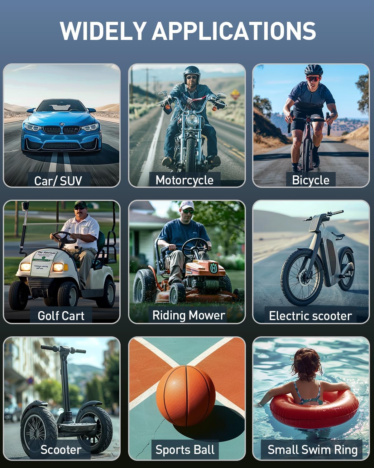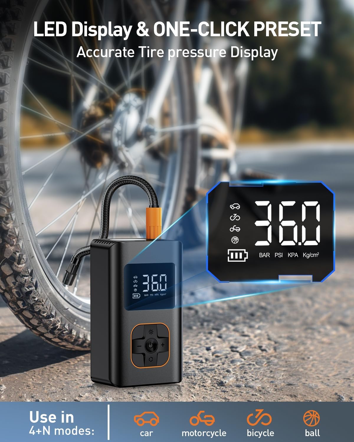 • 5 modos inteligentes y apagado automático: ofrece 4 modos de inflado preestablecidos (bicicletas, motocicletas, automóviles y pelotas). Una vez que se alcanza el valor de presión preestablecido, la bomba de aire se detiene automáticamente. El quinto modo personalizado le permite establecer valores de presión basados en el objeto de inflación para satisfacer diversas necesidades de inflación