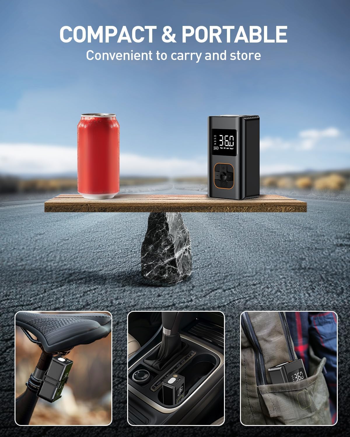 • Compacta y portátil: la bomba de aire portátil adopta un diseño compacto inalámbrico, que es compacto y cómodo de llevar. Este compresor de aire inalámbrico es fácil de almacenar en el automóvil, portabicicletas o mochila, por lo que es perfecto para usar en viajes o en casa