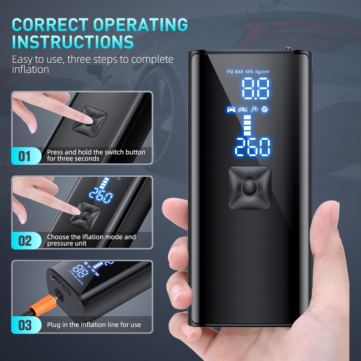 • 4 modos inteligentes + N: 4 modos de inflado preestablecidos (bicicleta, motocicleta, coche y pelota) son convenientes para que los principiantes elijan. El modo manual también puede establecer el valor de presión (3-150psi) de acuerdo con el objeto de inflado para cumplir con varios requisitos de inflación. Es una opción ideal para inflar automóviles, motocicletas, neumáticos de bicicleta