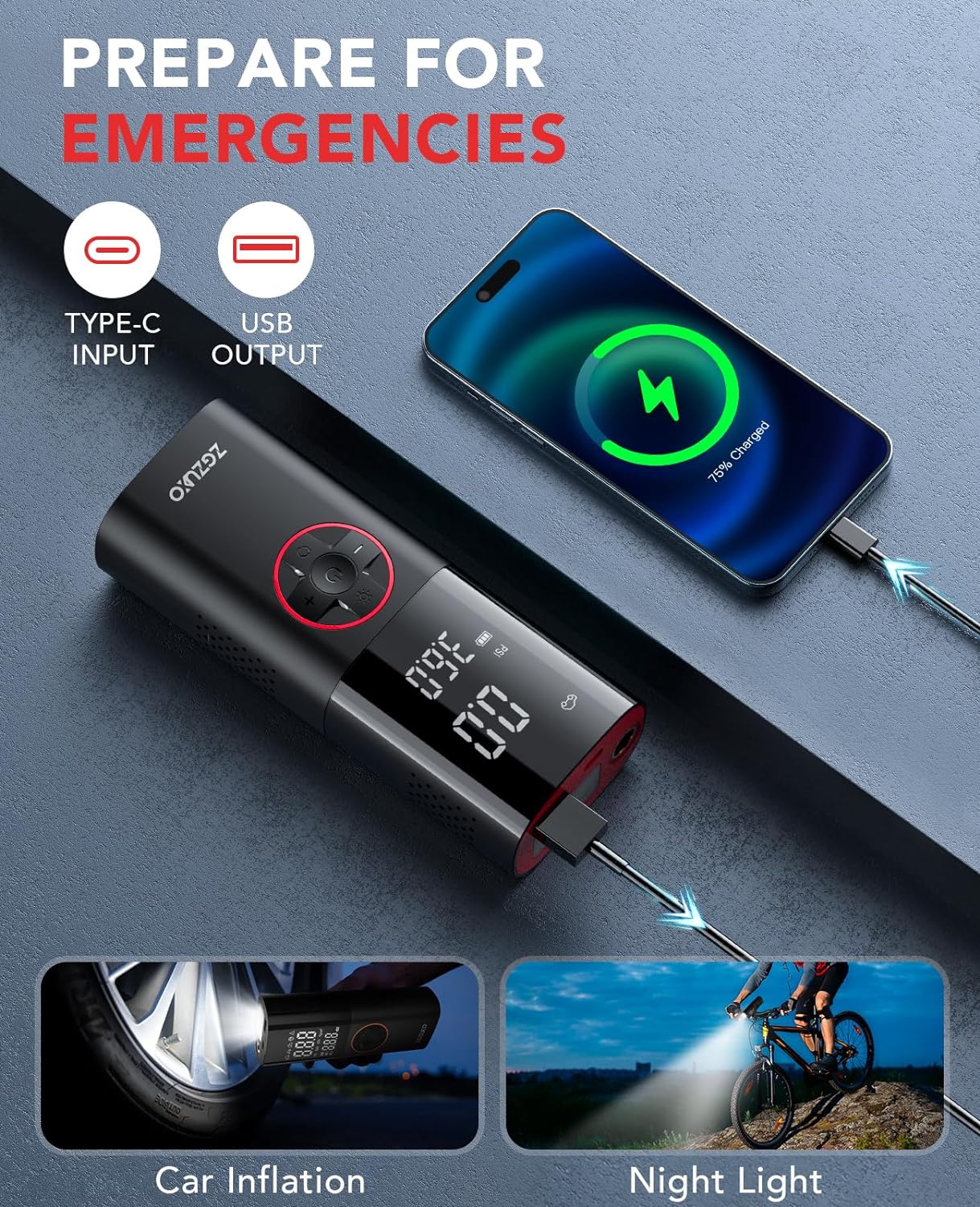 • Más allá del inflado de los neumáticos: esta bomba de aire incluye una luz LED con tres modos (SOS, constante, estroboscópico) para uso en situaciones de poca luz y emergencias. También tiene un puerto USB-C de 5 V/1 A para cargar un teléfono, por lo que es perfecto para situaciones de carretera y nocturnas