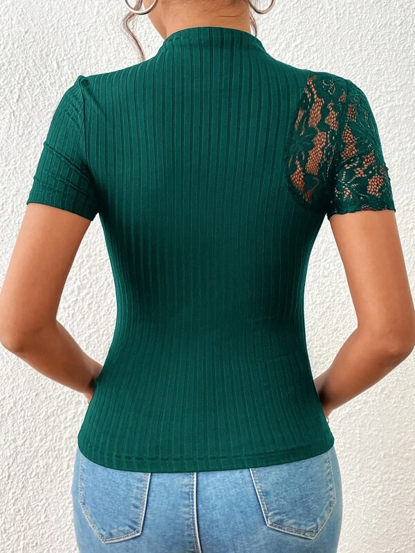 SHEIN Privé Camiseta con encaje en contraste de cuello alto
