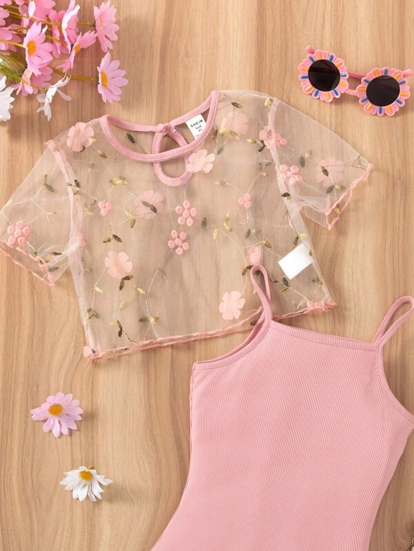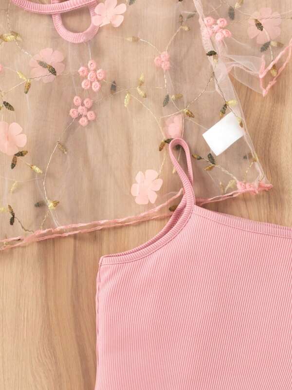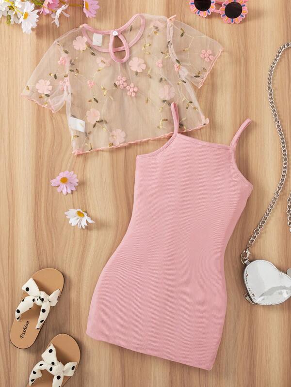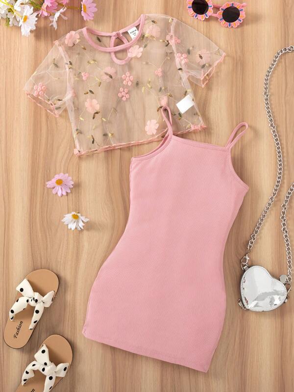 Ribbed Solid Cami Dress & Flower Embroidery Top