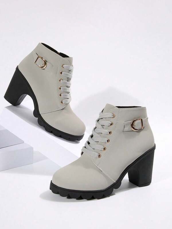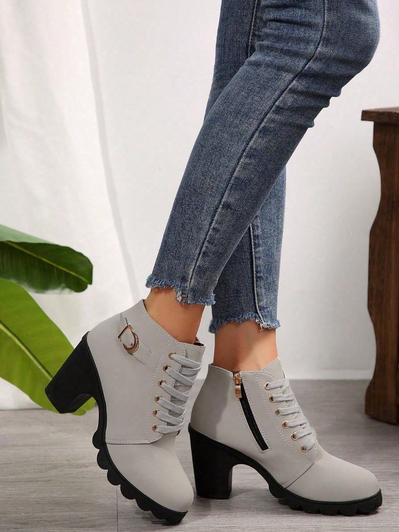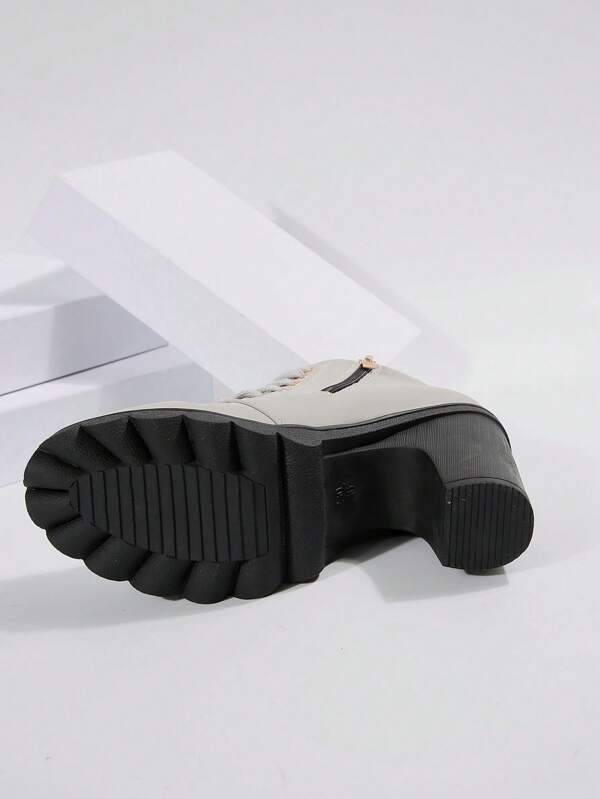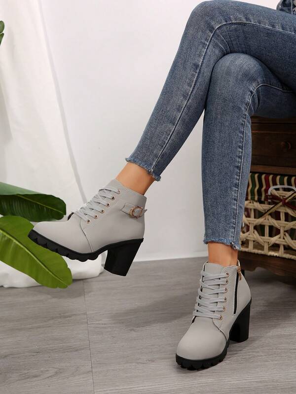 Lace Up Side Zipper Slip On Round Toe Chunky Heel Shoes, Casual Comfy Shoes